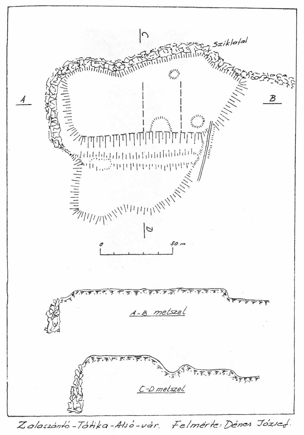 1. A küls? sánc közel kör alakú, kb. 100 m átmér?j?, s helyenként majdnem négy méter magas. A sánc mögött a küls? környezetnél 1 m-rel magasabb árok, majd újabb kb. 2 m magas sánc helyezkedik el. Ez közel négyzetes, oldalhossza kb. 25 m. A bels? sánc sarkai kinyúlnak, így a létesítmény konkáv ívnégyszög alakú. A bels? sáncon belül újabb mélyedés tapasztalható. A küls? sáncon, a két sánc közötti árokban és kis felületen a középs? mélyedésben második világháborús l?állások vannak. Terei György a lel?helyet felmérte.