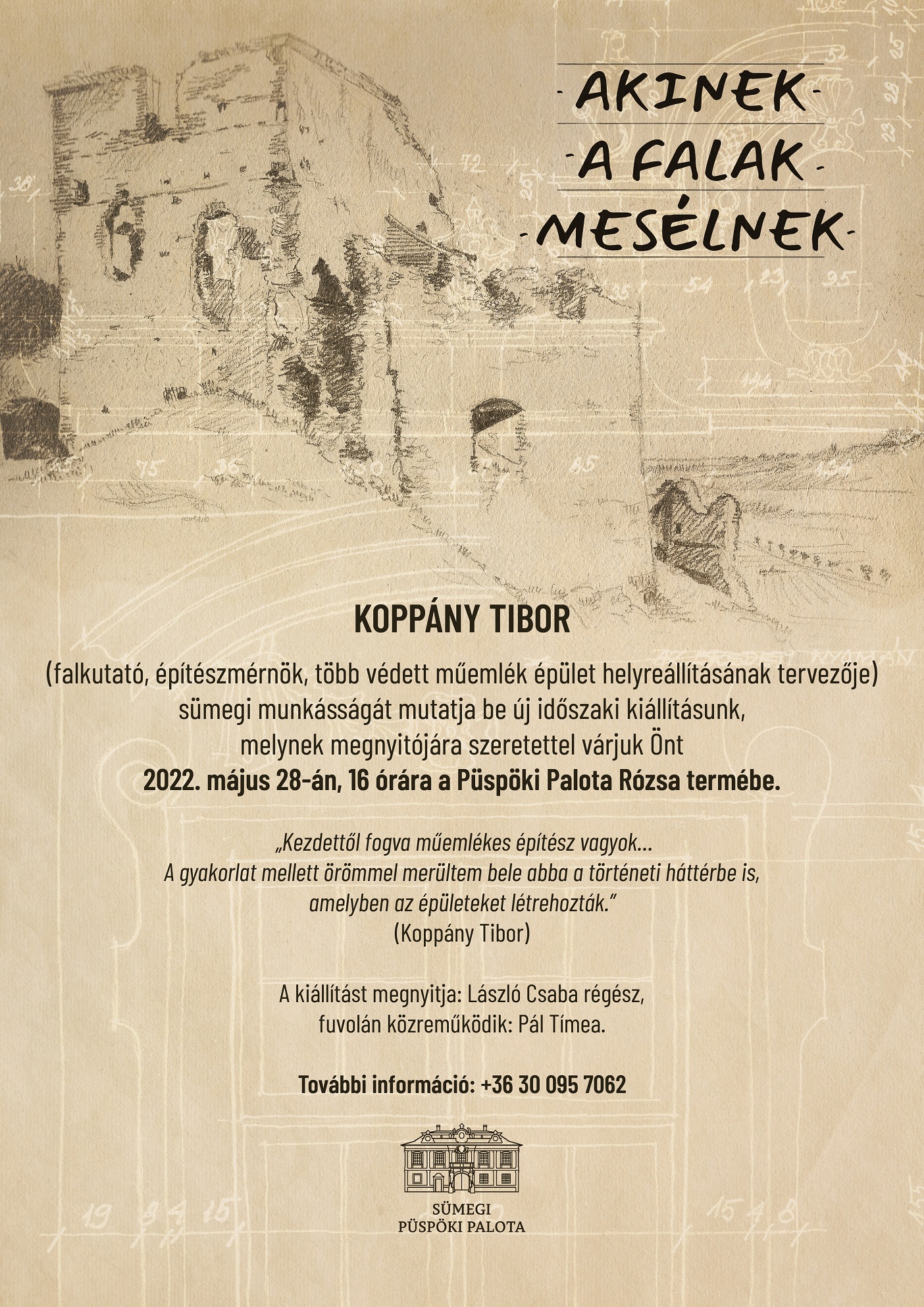 Koppány Tibor (falkutató, építészmérnök, több védett műemlék épület helyreállításának tervezője) sümegi munkásságát mutatja be a Püspöki Palota új időszaki kiállítása, melynek megnyitójára szeretettel várnak Mindenkit 2022. május 28-án, 16 órára.