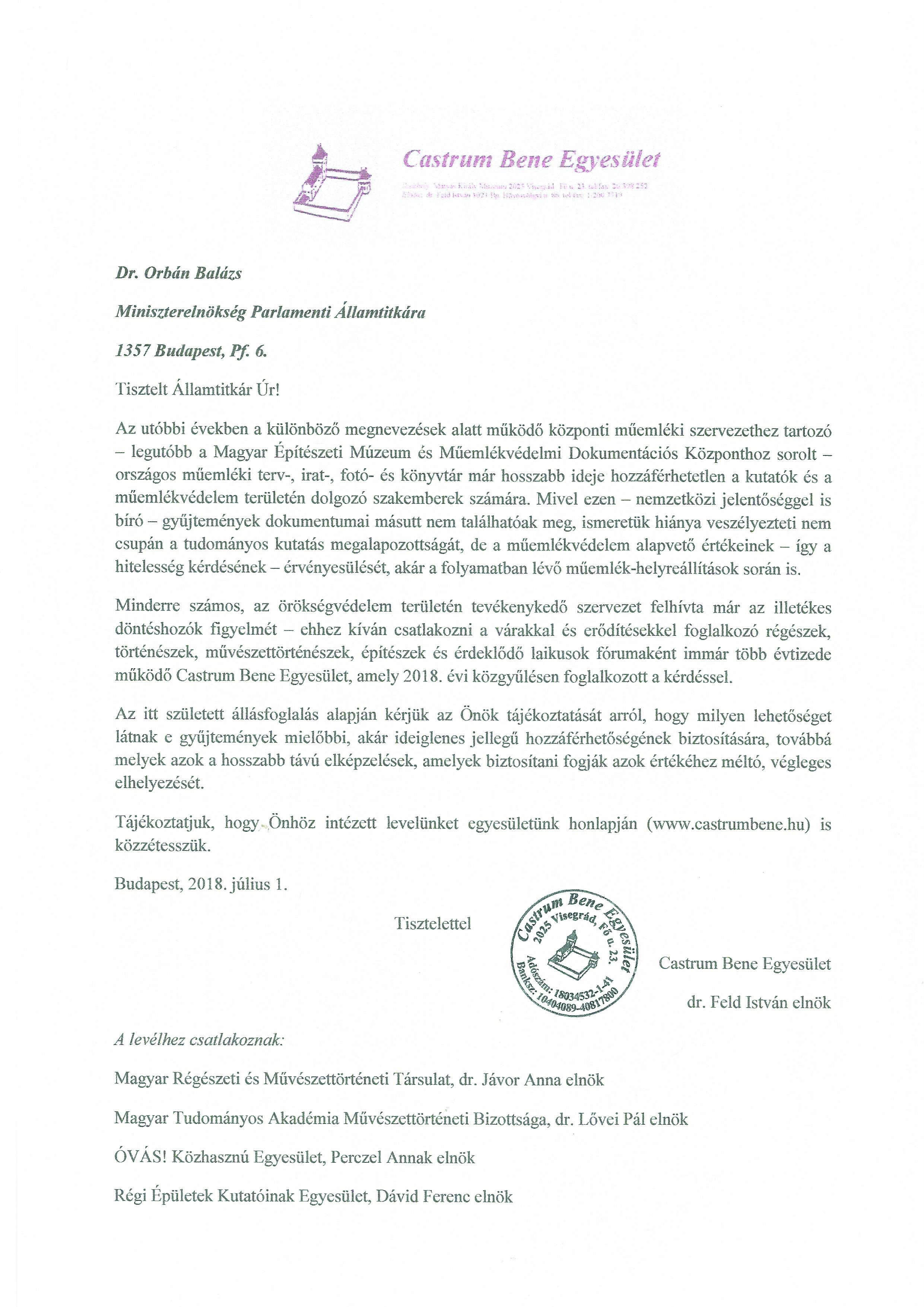 A Castrum Bene Egyesület közgyűlésén hozott határozat alapján az alábbi levelet intéztük dr. Orbán Balázs államtitkárhoz , s hasonló szövegű levéllel fordultunk a gyűjtemények közvetlen felelőséhez, dr. Varga Mariann megbízott igazgatóhoz is, a Magyar Építészeti Múzeum és Műemlékvédelmi Dokumentációs Központ vezetőjéhez. Az utóbbitól kapott válasz ugyancsak alább olvasható.
